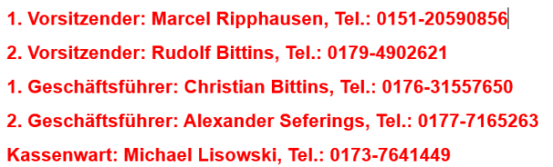 Als Beisitzer wurden gewählt: Simon Becker, Kevin Gulba, Hans Jansen, Jürgen Jansen, Tom Jansen, Wilfried Lisowski, Jeremy Weber, Reinhold Weber. Wir wünschen allen eine glückliche Hand.